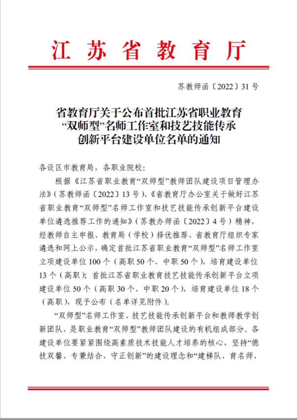 2022年8月2日,江苏省教育厅关于公布首批江苏省职业教育“双师型”名师工作室和技艺技能传承创新平台建设单位名单的通知公布,我校动物工程学院朱广琴教授领衔的“江苏省职业教育现代养殖技术‘双师型’名师工作室”被成功立项建设,获批建设经费30万元。